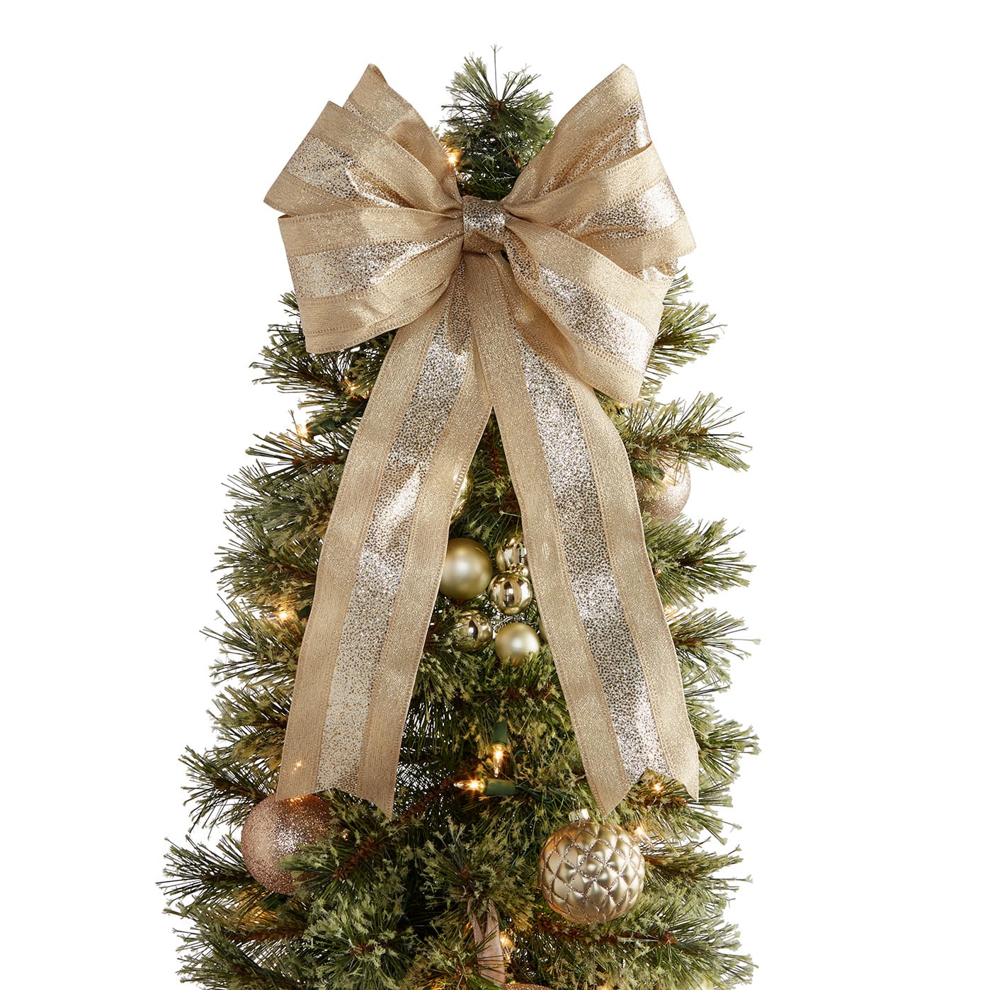 Bow For The Top Of Christmas Tree - To make your first loop unravel about 12 inches of ribbon from your roll and create a loop. It measures approx16 inches across the top of the bow and 38 inches long. Depending on how large you would like your bow to be you can adjust the size of the loops. Your three rolls of ribbon should be in the accompanying.